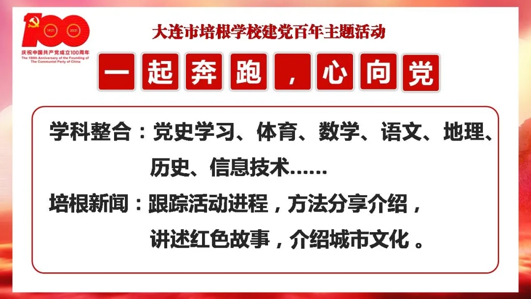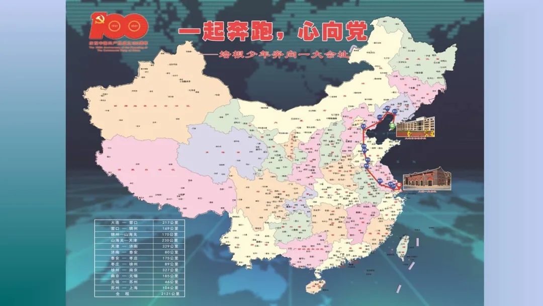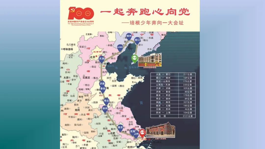 各个班级沿着地图上的既定路线,从大连市培根学校出发,寻着革命的足迹,一路奔跑,在7月1日党的生日之前到达上海一大会址,全程2121公里。其中,途径营口、锦州、山海关、天津、济南、泰安、枣庄、徐州、南京、无锡、苏州等城市。途中,同学们可以追寻红色足迹,查阅城市相关历史资料,了解革命历史,传承革命精神。让我们通过短片,了解具体活动内容。