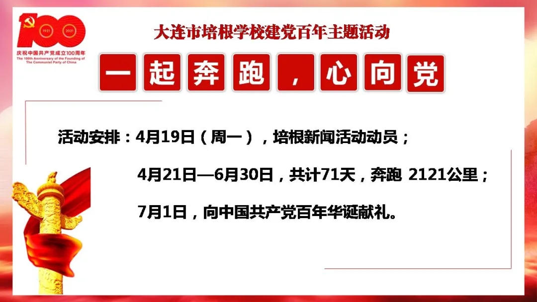 每日晨跑已然成为了培根少年的运动习惯,活动中,让我们以班级为单位,累加每日运动的公里数,向一大会址奔跑,为中国共产党的百年华诞献礼。